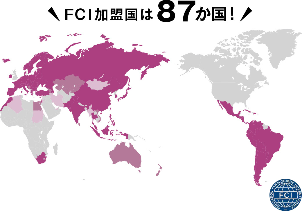 FCIは、畜犬に関する国際的な統括団体です。現在、FCIには世界87カ国もの国が加盟しており、JKCが発行する血統証明書は世界中で認められています。JKCの加盟は1979年であり、日本はアジア地区における代表国となっています。