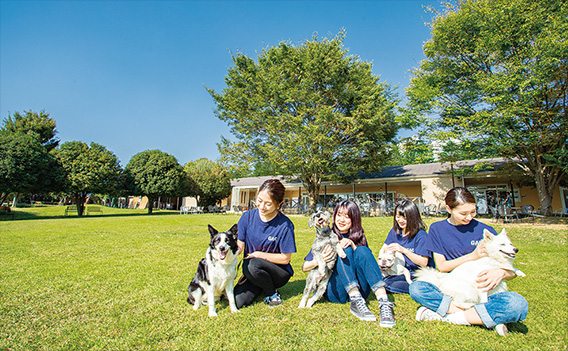 日本最大級の敷地面積3万㎡を誇る広大な名犬キャンパス(世界の名犬牧場)は、実践的な学習フィールドとして、さまざまな体験実習が行われます。犬のグルーミングはもちろんのこと、飼育管理実習からペットショップやドッグカフェでの接客など、人とのコミュニケーションも積極的に学びます。名犬キャンパスでの現場実習を通して豊かな人間性を育みます。