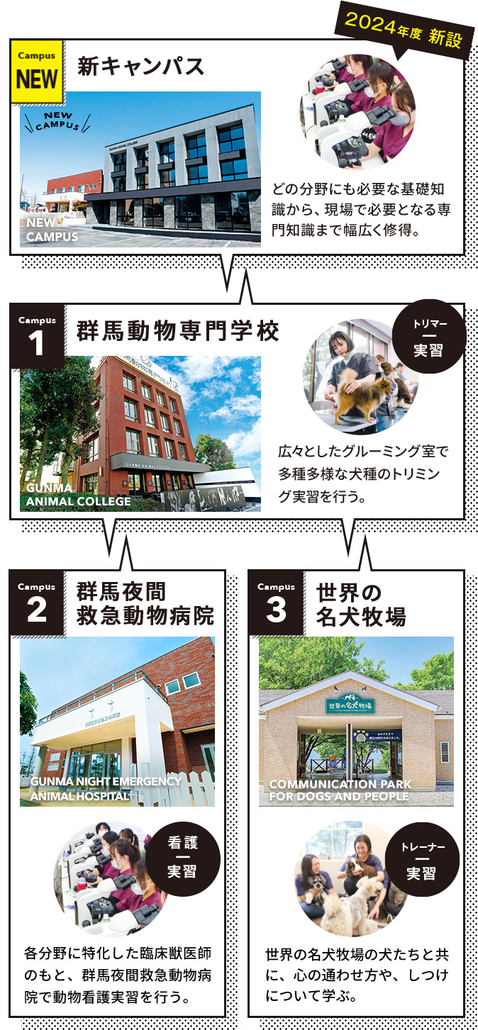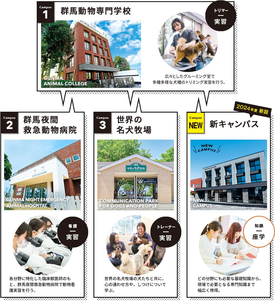 4つのキャンパス広大なフィールドでドッグトレーニングを学べる名犬キャンパス「世界の名犬牧場」、キャンパス敷地内に構え第一線の看護技術を学べる「群馬夜間救急動物病院」、トリミング実習や講義を受けるキャンパス「群馬動物専門学校」、そしておしゃれな学生ホールと充実した設備が整う「新キャンパス」。