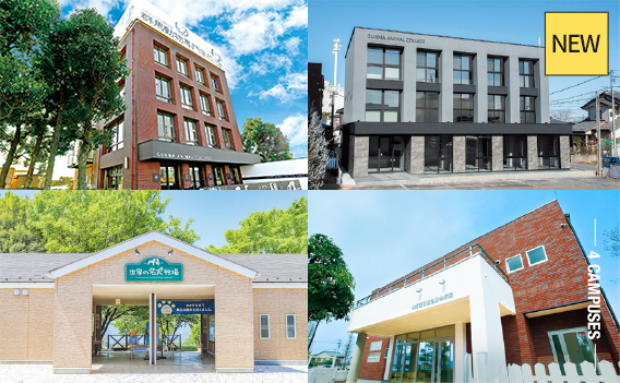 実際の現場で活躍するプロフェッショナルになる為には専門的な知識と確かな技術の両方が重要となります。本校では、一般に開かれ実際に機能している病院や、ドッグ・コミュニティパーク(世界の名犬牧場)を一つのキャンパスとして有し、質の高い実習を行うことが出来ます。また、2024年度に本校舎敷地内に新校舎が完成しました。3階建ての施設では、より充実したキャンパスライフを送ることができます。