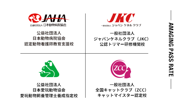 「就きたい職業」「なりたい自分」を実現するためには、社会で通用する確かな知識と技術を証明できる資格が必要です。本校では、動物と関わる仕事に必要な資格を在学中に取得できます。「日本動物病院協会」「ジャパンケネルクラブ(JKC)」「日本愛玩動物協会」「全国キャットクラブ(ZCC)」など、信頼ある団体や機関の厳しい審査基準をクリアし、指定・認定・公認された動物専門学校は日本でも本校だけとなります。