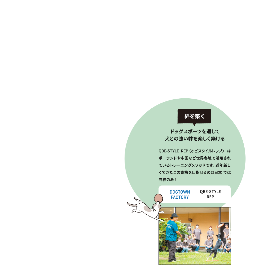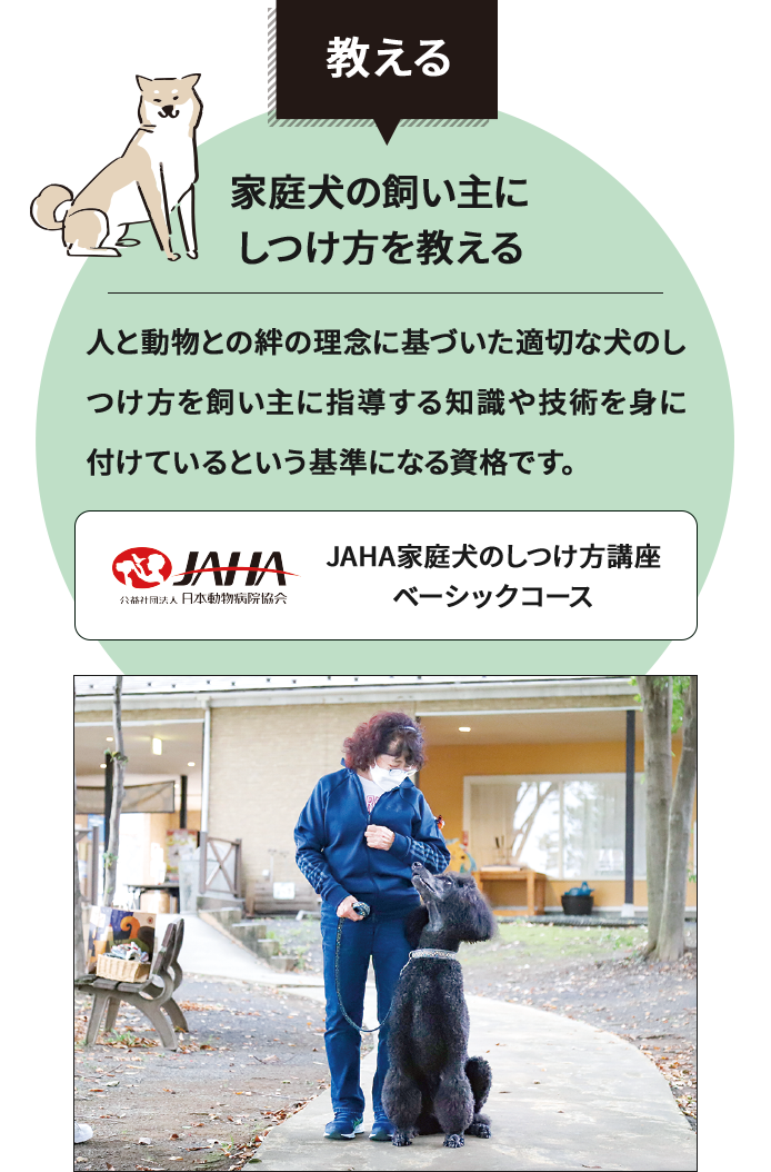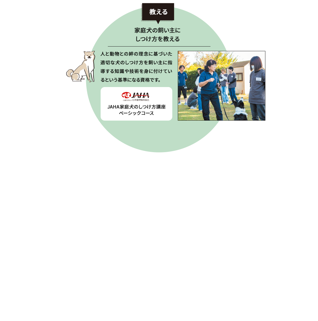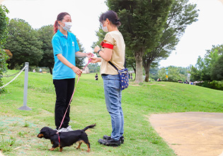 世界の名犬牧場やその他のイベントで行われる「Wan!Pass認定会」にて、プロのドッグトレーナーの指導の下、学生のうちから飼い主様とその愛犬に対してWan!Pass認定を行います。より実践的な学習を行った上でWan!Pass認定士試験に挑むことが出来る為、しつけについての知識や技術習得はもちろん、ドッグトレーナーにとって大切な飼い主様に伝える力が身に付きます!