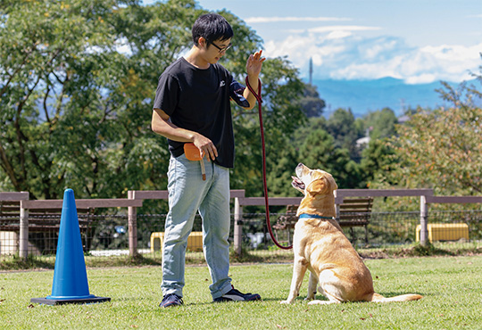 世界や日本国内の第一線で活躍する経験豊富なプロ訓練士による指導のもと、「世界の名犬牧場」の広大なフィールドで犬と共に学び合いながら実践を積むカリキュラム。家庭犬のしつけから高度な訓練を必要とする使役犬やドッグスポーツのトレーニング技術も習得できます。現場実習では飼育管理やペットビジネス学としてドッグランやサロンなど動物業界に必要なスキルを現場で学びます。
