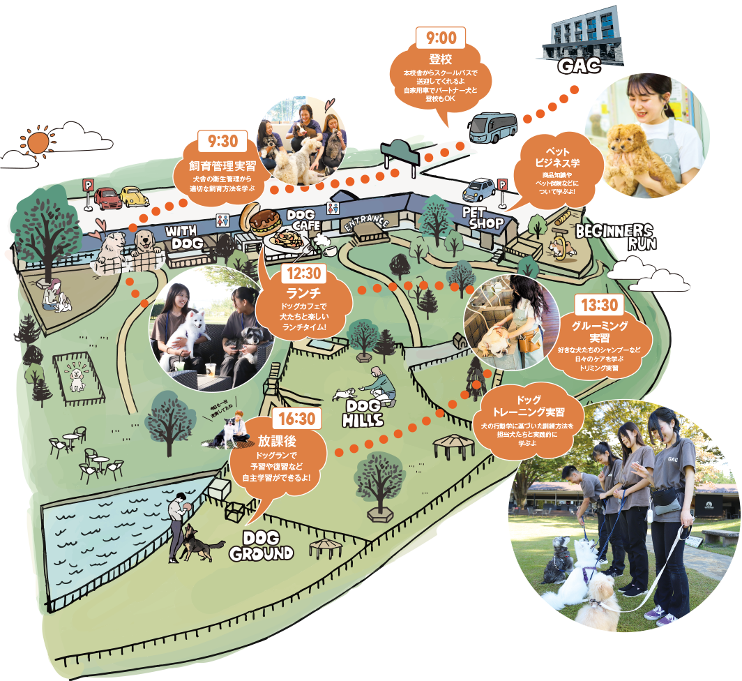 犬に関する総合施設を活用し、そこで活躍するプロフェッショナルから幅広いスキルを身につけることができます。