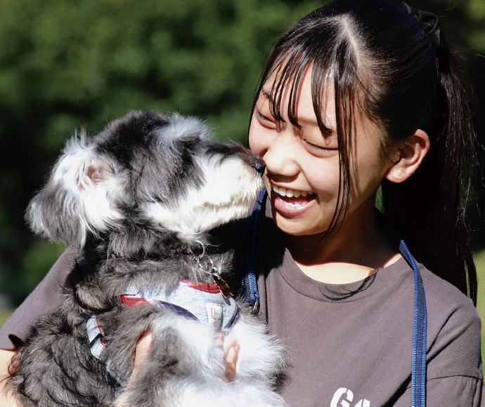 動物総合学科で実際に学んでみてどのコースに進むかも決められるし、 就職した時にコースの分野に関わらず飼い主の質問に答えられるようになると感じています。私はパートナー犬制度を利用していますが、仔犬の時から一緒に授業に参加することで、しつけ方や、マッサージ方法など時間をたくさんかけて学ぶことが出来ます。ドッグトレーニングはすぐに結果が出なく大変なこともありますが、何回もトレーニングを繰り返し行うことで段々と犬もできるようになっていき、 そして完璧にできるようにさせると達成感がありそこが楽しさだと思います。