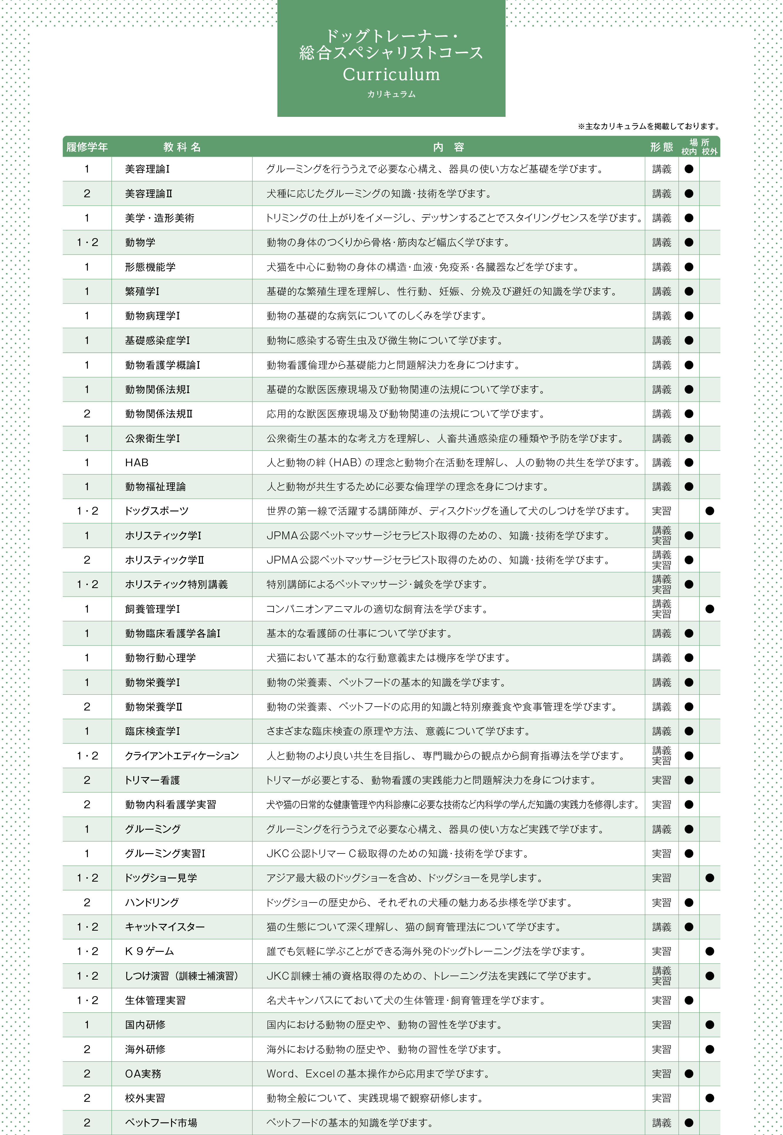 | 4 | 15:10-16:40 | ペットビジネス学 | しつけ実習 | 動物栄養学 | ドッグスポーツ | 訓練士補実習 |