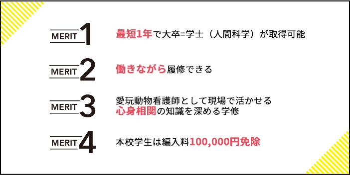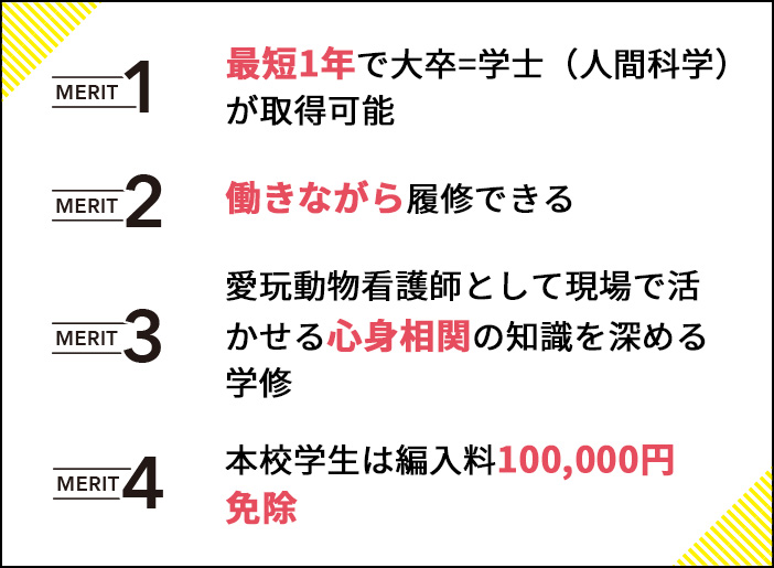 本校の愛玩動物看護師コース卒業生は、人間総合科学大学4年次【通信制】に編入することができるようになりました。
