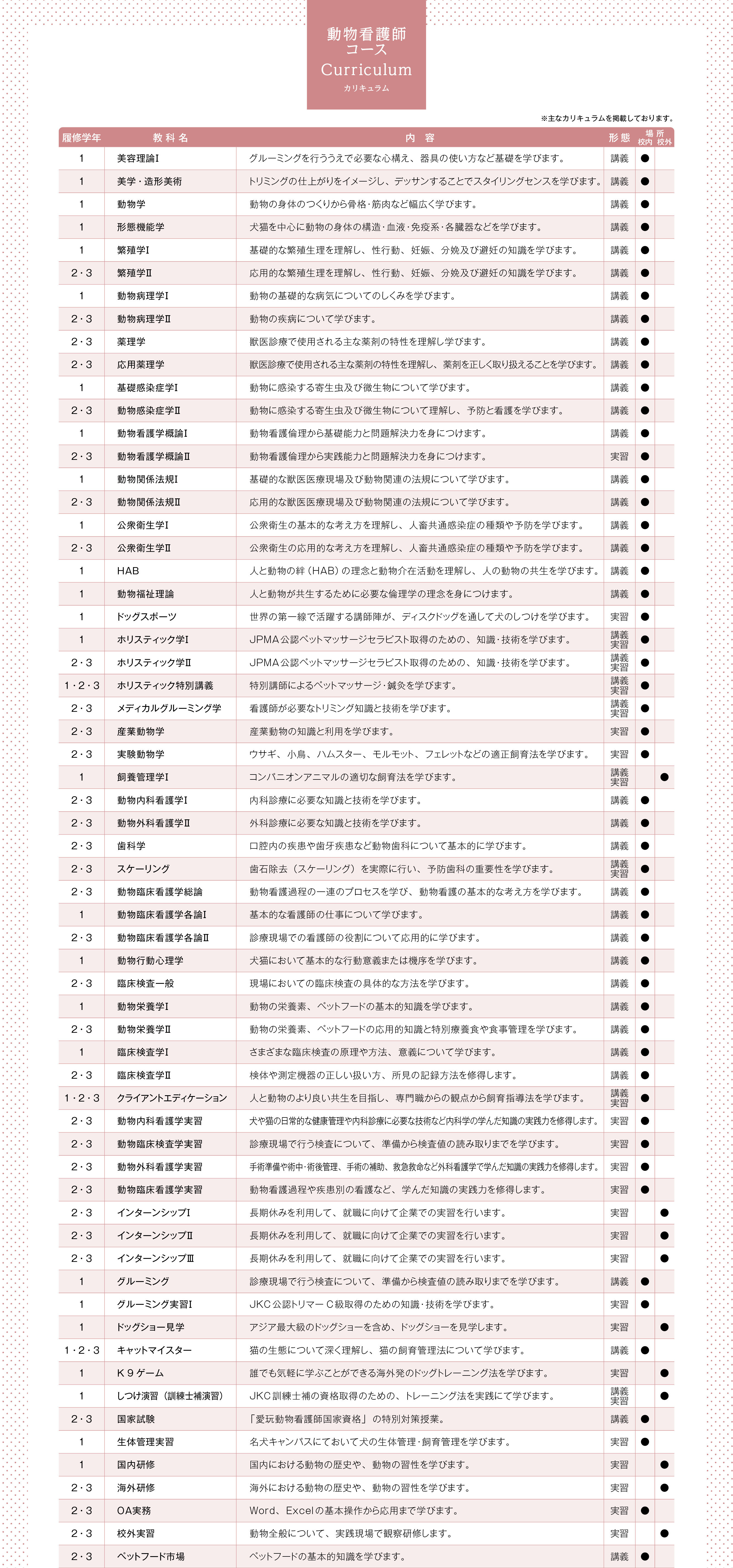| 3 | 13:30-15:00 | 動物臨床看護学総論 | 動物看護学概論 | 動物病理学 | 動物内科看護学実習 | 動物感染症学 |