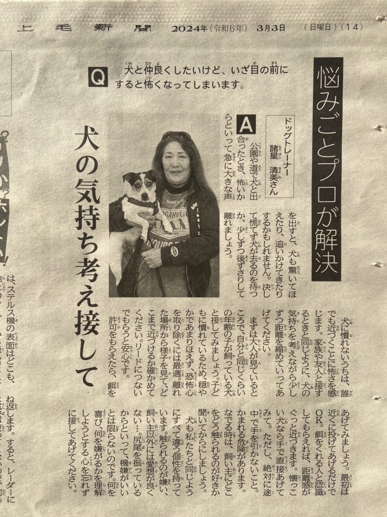 本校のドッグトレーナー総合スペシャリストコース講師でドッグトレーナーの諸星 清美先生が3月3日(日)の上毛新聞で紹介されました。