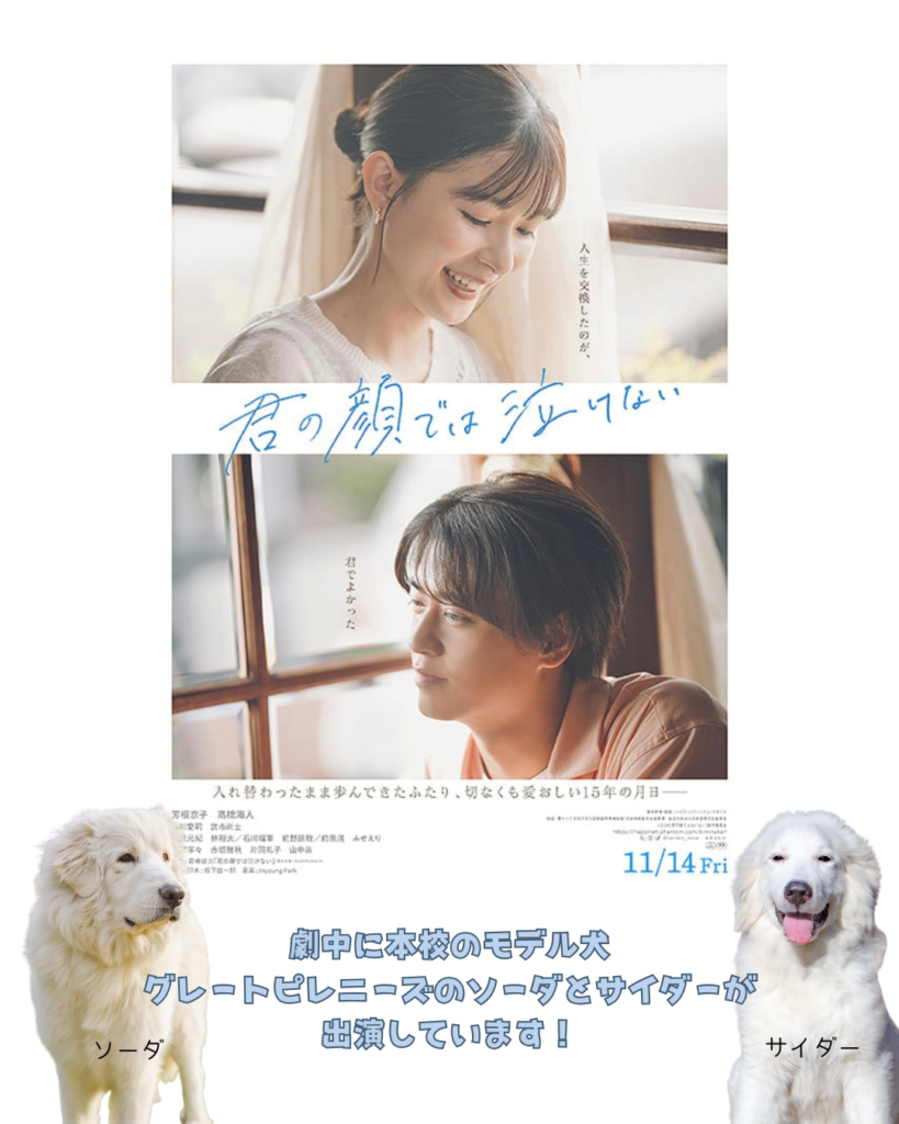 現在公開中の映画『君の顔では泣けない』に、本校のモデル犬、グレートピレニーズの“ソーダ”と“サイダー”が出演しています!
