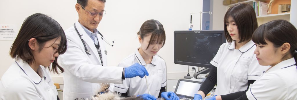 妊娠中の学校犬の検診をして、順調な発育を確認します。