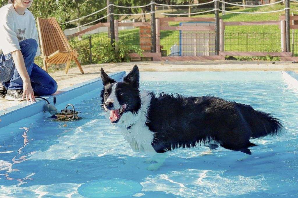 名犬牧場のわんちゃん専用プールにて、楽しいプールの遊び方体験を行います。 水が苦手な子も、泳げない子も、プールデビューの子も、プロのドッグトレーナーが優しく丁寧に楽しみ方をレクチャーいたします♪