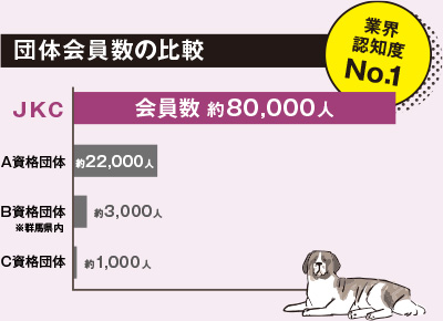 JKCの発足は1949年と73年もの歴史を誇り、日本全国にいる会員数は8万人、ドッグスペシャリスト育成のため「トリマー」「ハンドラー」「訓練士」「審査員」「アニマル衛生看護士」のライセンスを発行しており、その資格は世界に通用する技術の証明となります。