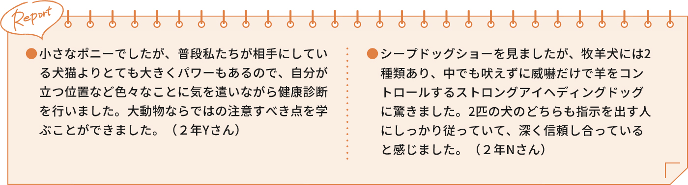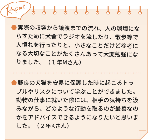 本校は、日本全国の動物病院やトリミングサロン、ペットショップはもちろん、動物愛護センターやテーマパーク(動物園)なども多数提携しており、そのため学生は幅広い分野において実際の現場を通して学ぶことができます。